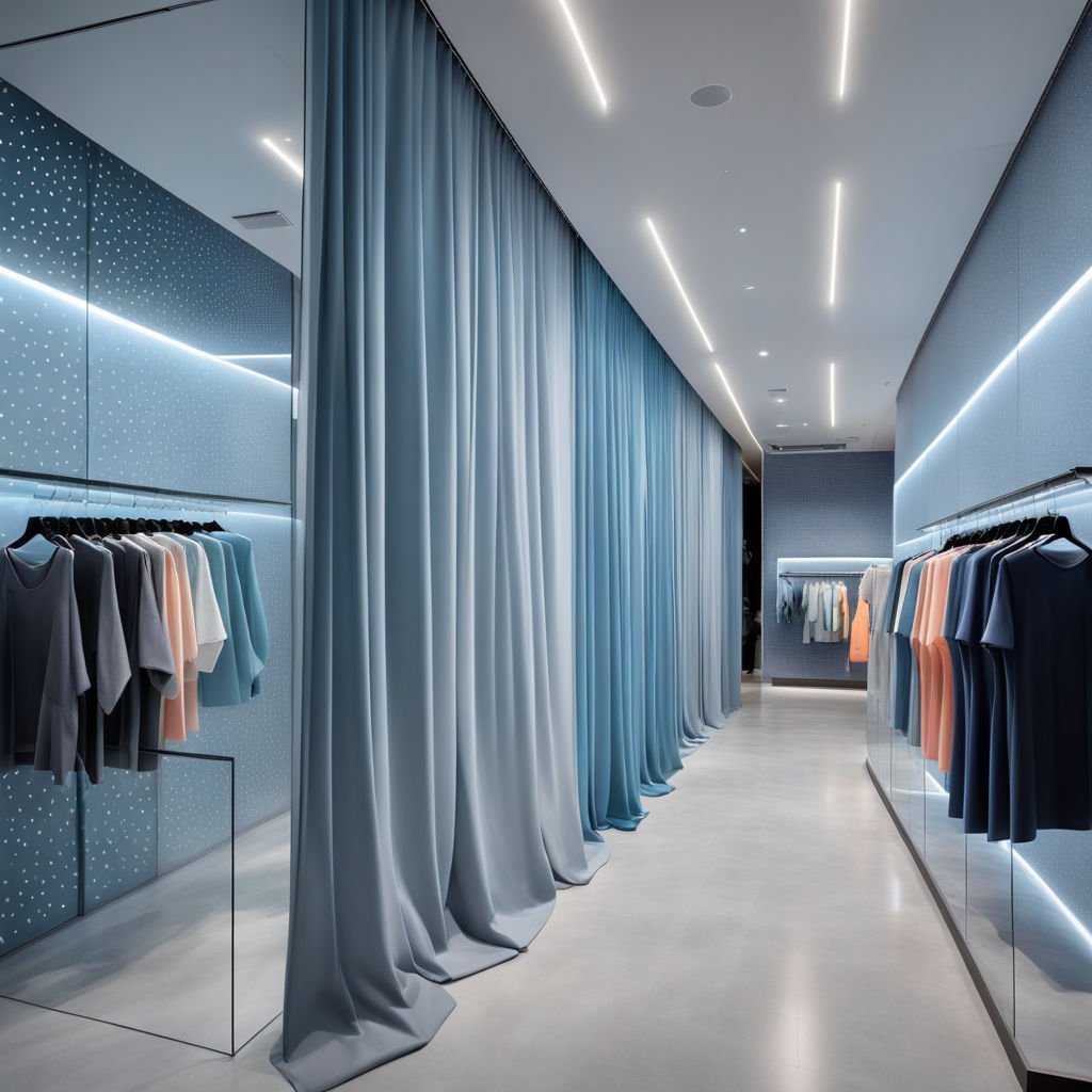 As you step into the boutique, you’re greeted by the gentle curve of the ceiling, designed to resemble a wave—one that carries a sense of calm from the sea, wrapping the space in a cozy, enveloping feel. The ceiling isn’t just a visual element; it’s an experience, guiding you into a world where the ocean meets elegance. This wave is illuminated by soft, indirect lighting, casting a warm, inviting glow over the entire space, especially the curtains. The fabric drapes from the walls, not just framing the room but creating a silky, wavy ambiance that feels almost like the boutique is dressed in a gown itself. The texture of the curtains, combined with the lighting, gives the entire area a sense of flow, making every step you take feel part of the boutique’s story.