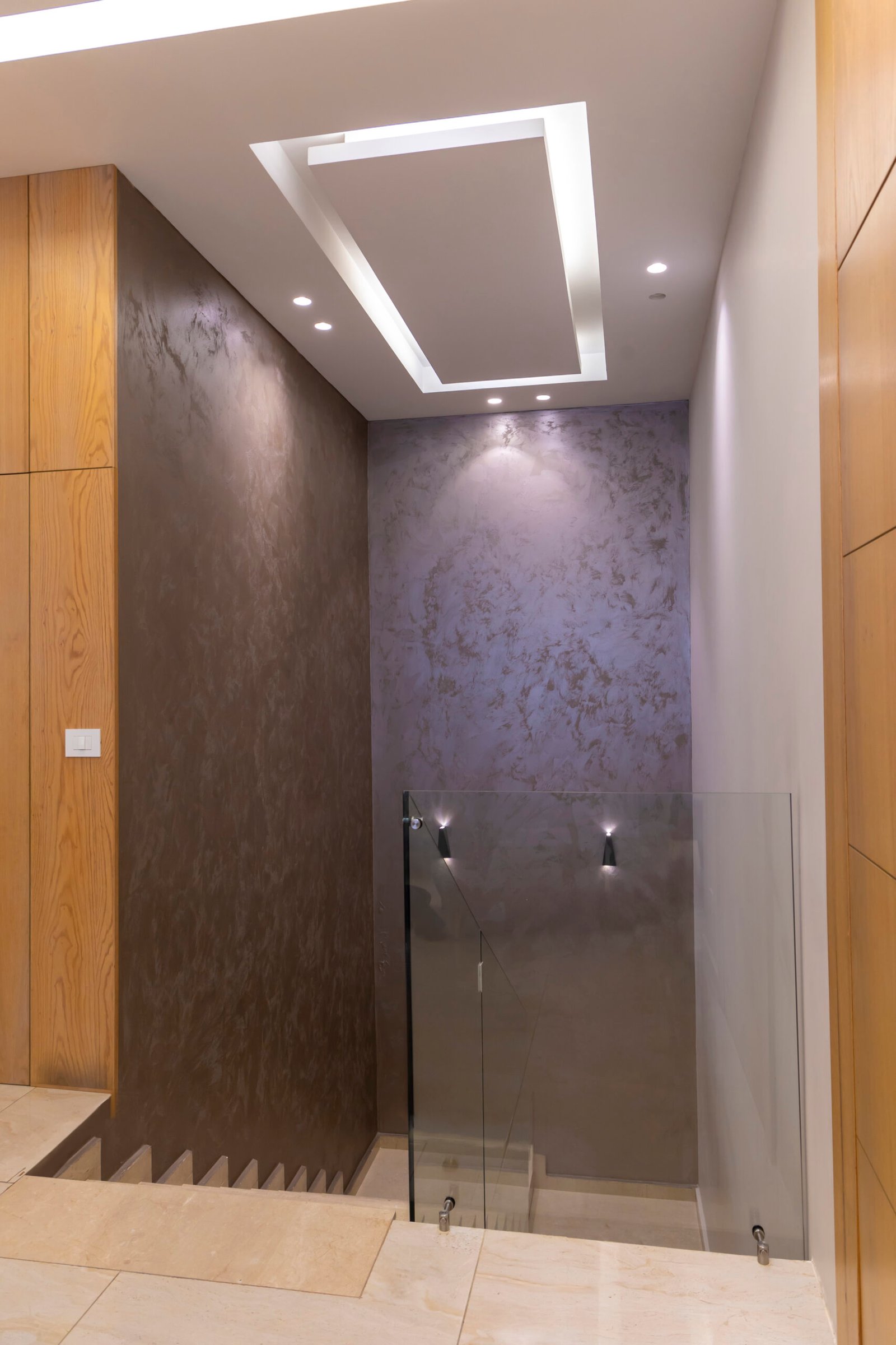 The staircase became a visual delight, with a beautifully illuminated wall, finished in stucco paint, guiding the family downstairs to their rooms—a warm, elegant goodnight. The stairs themselves were sleek, with glass and a minimalist stainless steel handrail, creating an air of sophistication.