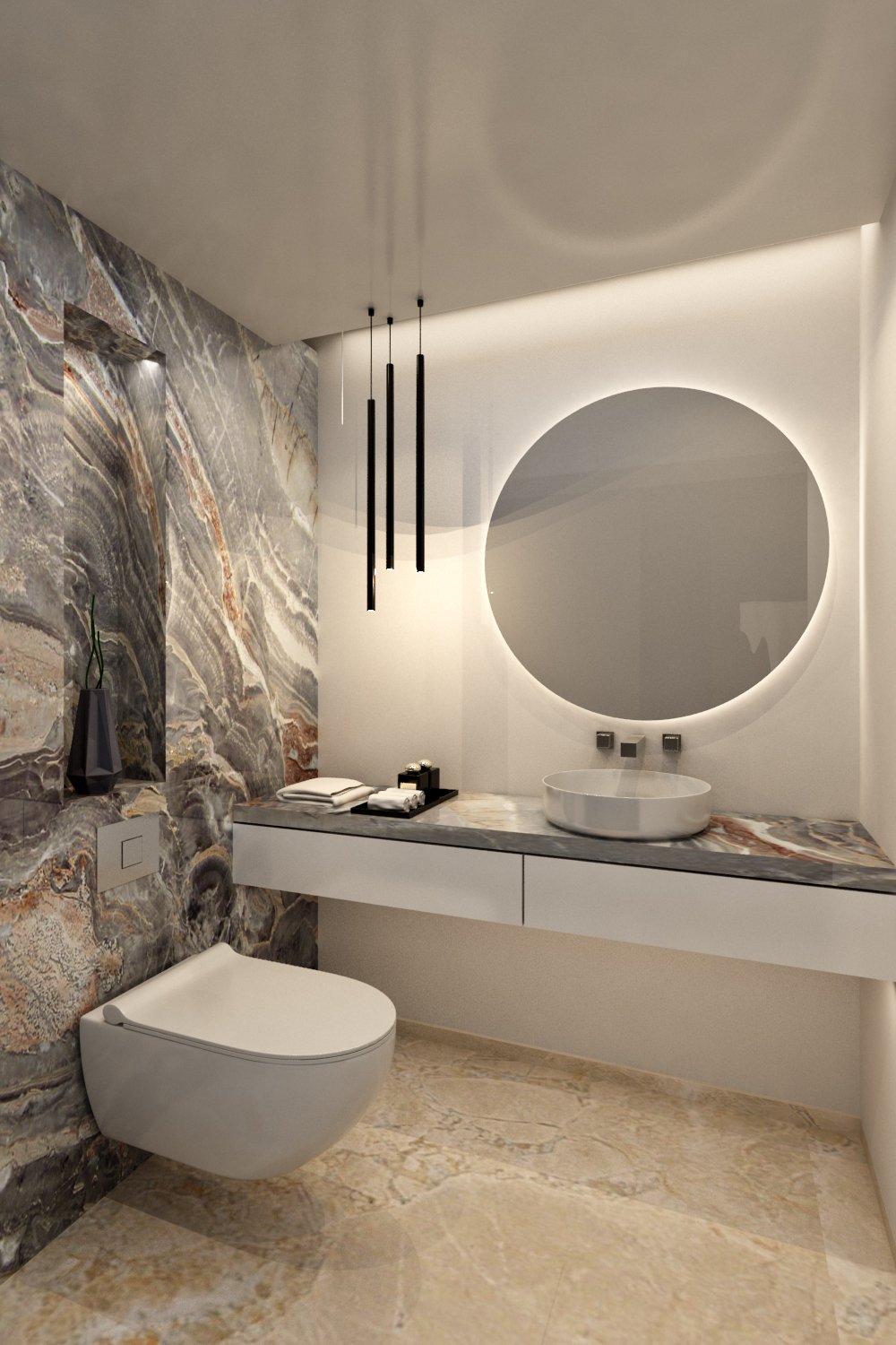 The design of the wooden wall cladding cleverly concealed two hidden doors—one leading to the kitchen and the other to a guest WC. This WC became a statement piece, finished in luxurious black marble with gold and white veins, featuring a decorative niche softly lit with indirect lighting. The kitchen was another masterpiece, tailored to fit the space precisely, complete with all the necessary accessories and exceptional functionality.
